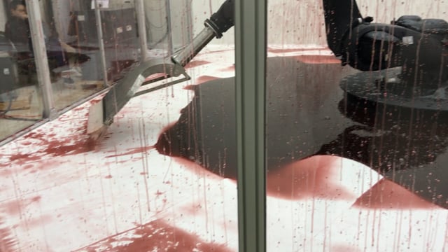A large industrial robotic arm futilely tries to clean up a blood-red mess from the floor of The Guggenheim in the art installation Cant Help Myself by Sun Yuan and Peng Yu.